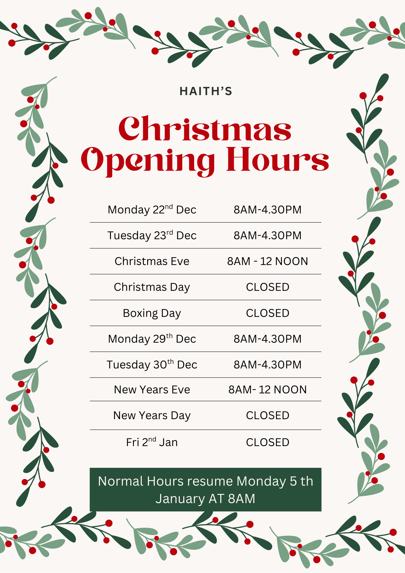 Our festive opening hours, so you can plan with confidence.